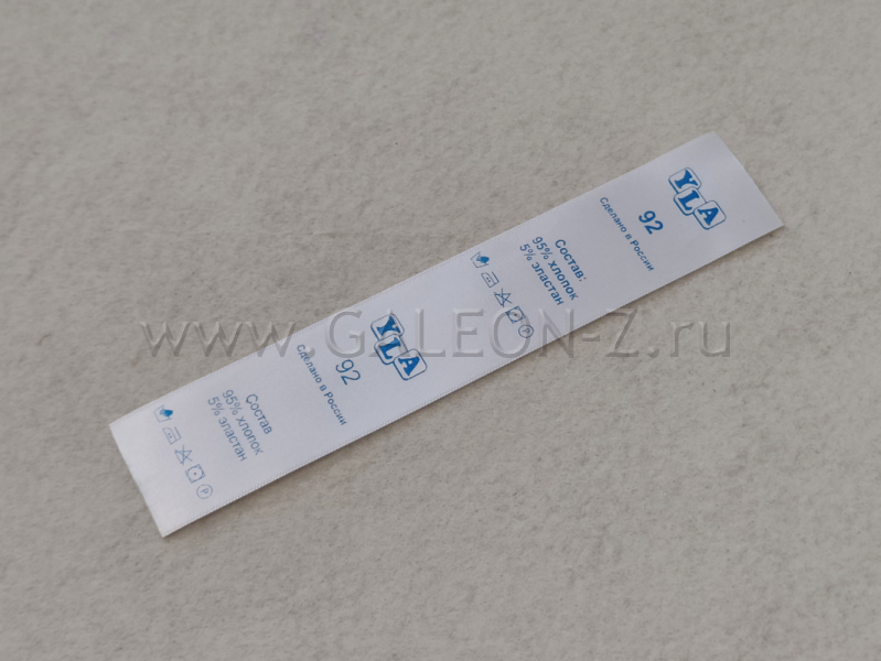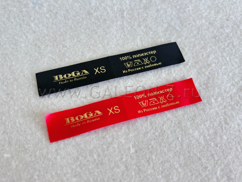 Сатиновая лента — отличается мягкостью и нежностью. Этикетки составники из сатина рекомендуются для одежды из тонких тканей: платьев, блузок и детской одежды. Как и атлас, сатин нарезается горячей струной. Предлагается в разнообразной палитре цветов.