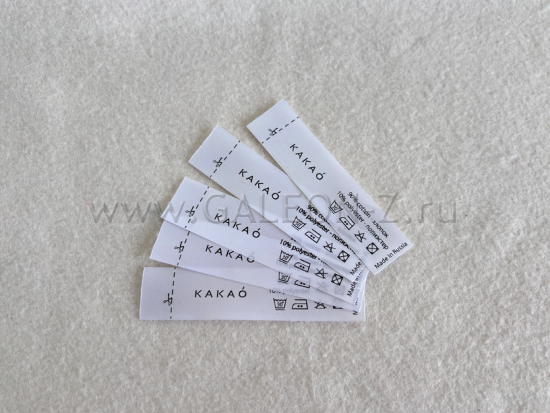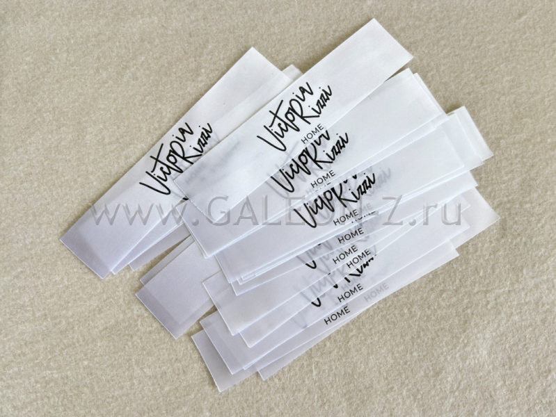 Силикон — мягкий, эластичный и гипоаллергенный материал. Этикетки из силикона не вызывают дискомфорта при носке и идеальны для нижнего белья, спортивной одежды и детских вещей. Как и нейлон, силикон не крошится при резке и нарезается холодным ножом. Предлагается исключительно в белом матовом исполнении.
