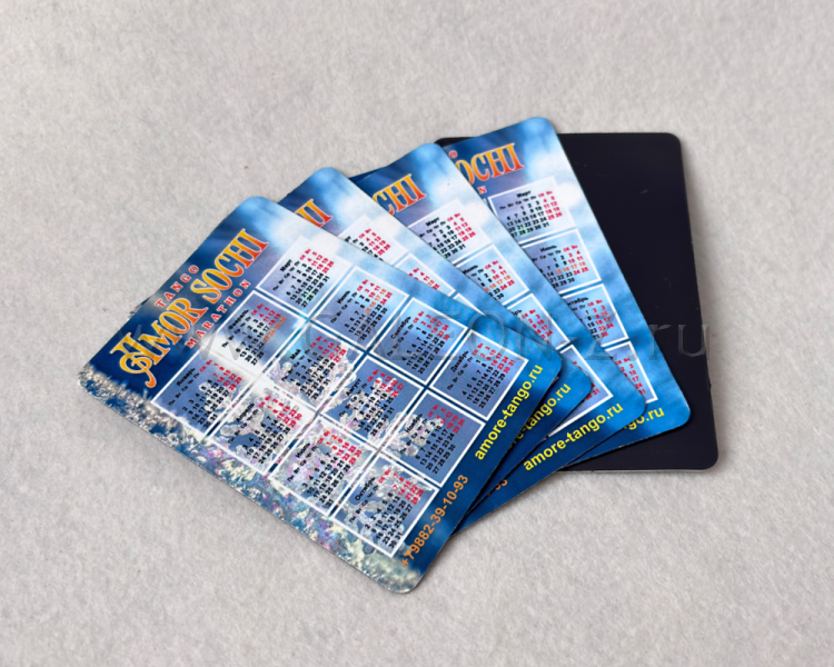 Магнитный календарь представляет собой магнитный винил с полноцветным изображением календарной сетки. Он прочно держится на металлических поверхностях. Изображение наносится методом офсетной или цифровой печати и затем ламинируется.