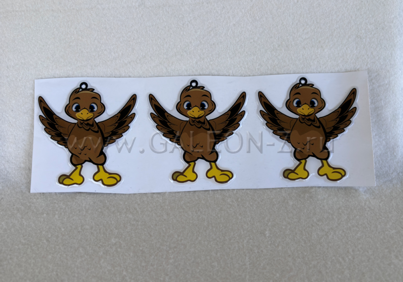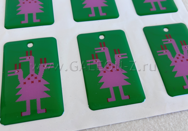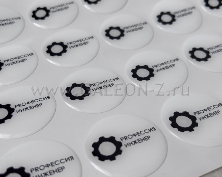 В зависимости от формы, размера наклеек и смолы, полимерная линза может иметь толщину от 1 до 2,5 мм. К тому же может быть гибкой или очень твердой. Но в обоих случаях заливка смолой позволяет значительно увеличить срок службы наклейки, защищает ее изображение от агрессивных воздействий окружающей среды, механических и химических воздействий.